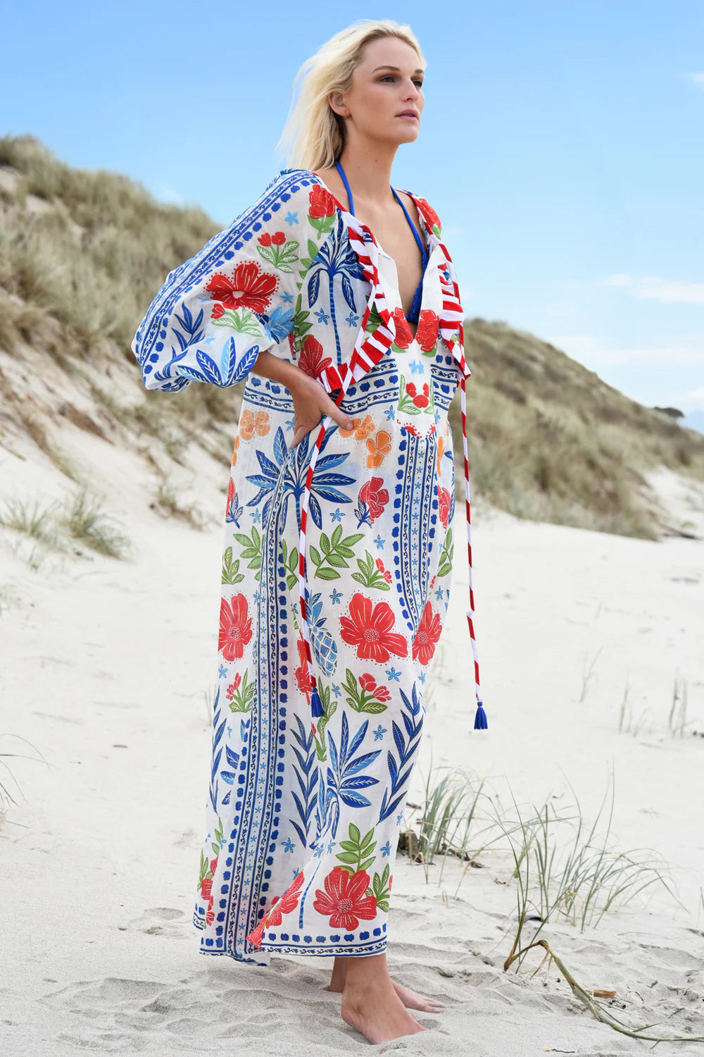 Artfully mixing patterns to perfection, introducing the ‘Pineapple Punch’ fabrication showcased in the ‘Follow Me’ dress. Featuring a notch neckline with tassel tie, the dress boasts raglan inset sleeves with fixed cuffs, a contrast stripe ruffle through the chest, and is complete with delicate floral embroidery adorned through placket. Fabulous for holidays, parties or the weekend